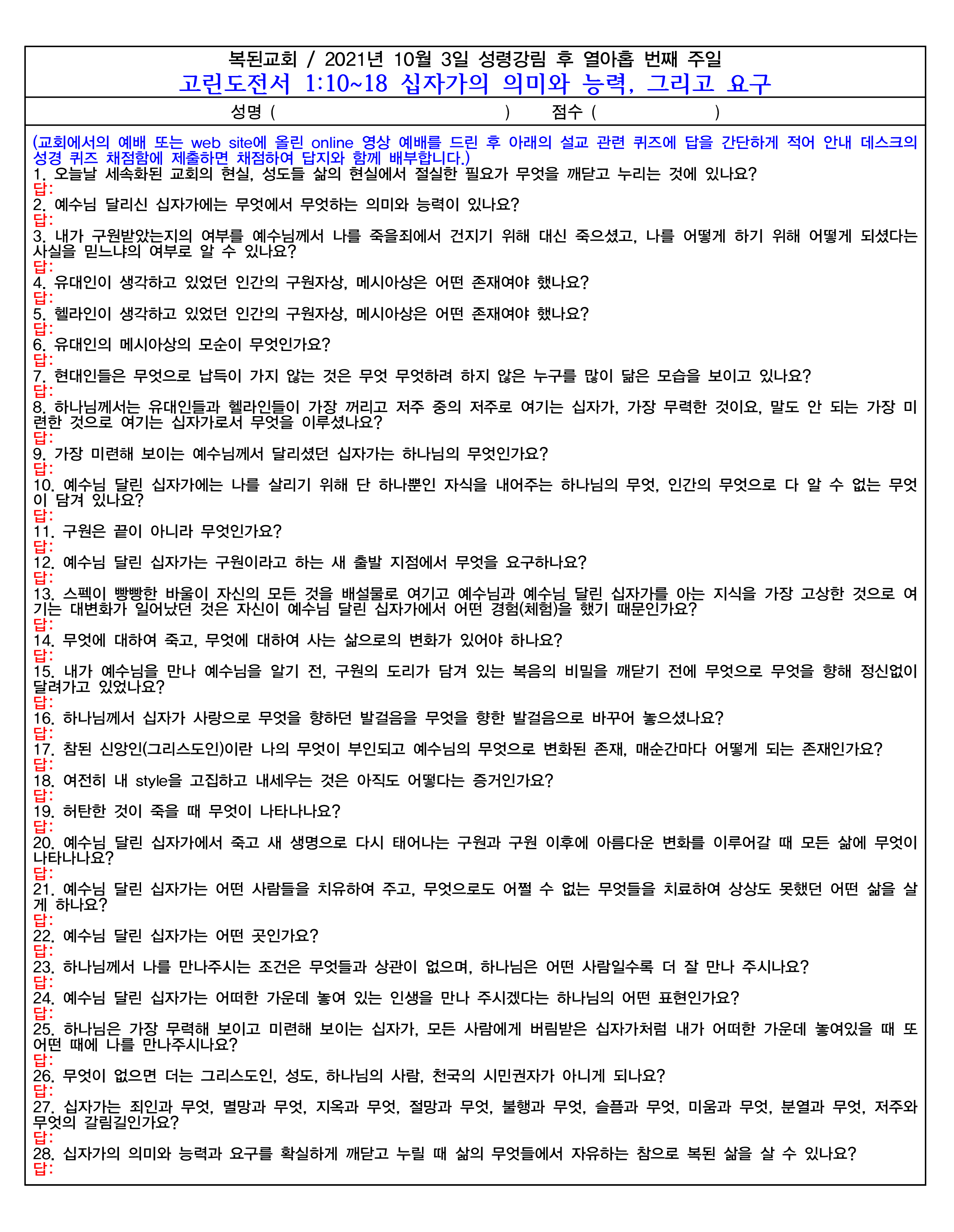 또 다른 방법은 아래의 댓글에 성명, email 주소와 함께 번호와 답을 적어 놓으면 채점한 파일과 정답 파일을 보내드립니다. 아래의 댓글에 답을 적는 example로서 2021년 8월 1일 주일 설교 퀴즈를 참고하십시오.