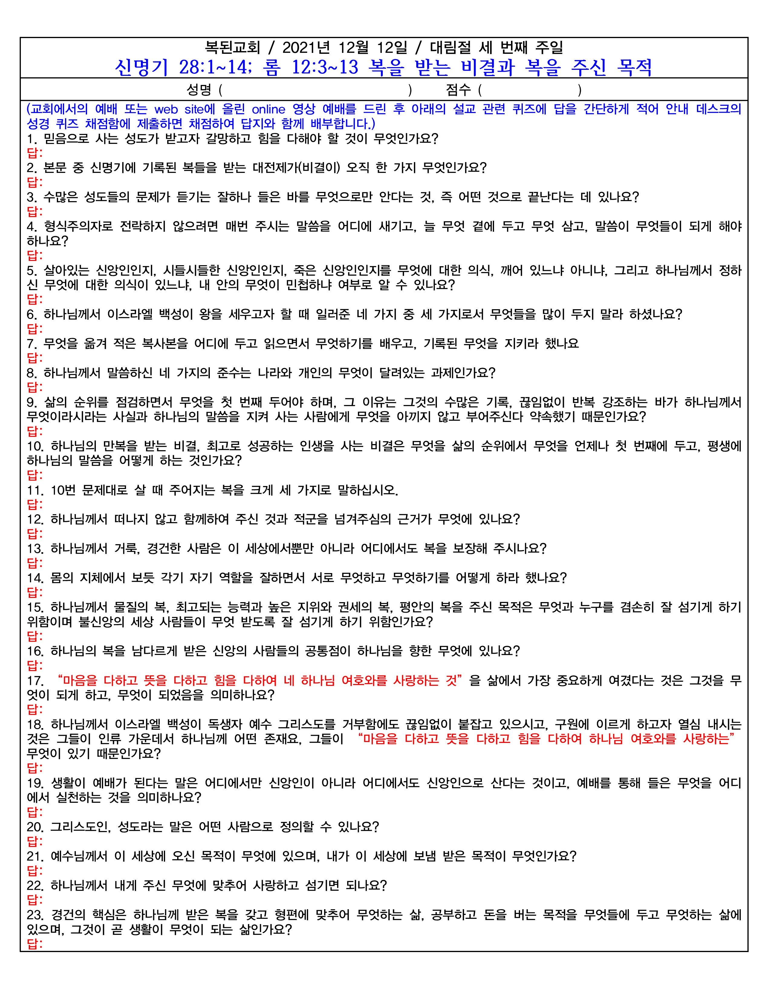 또 다른 방법은 아래의 댓글에 성명, email 주소와 함께 번호와 답을 적어 놓으면 채점한 파일과 정답 파일을 보내드립니다. 아래의 댓글에 답을 적는 example로서 2021년 10월 3일 주일 설교 퀴즈를 참고하십시오.