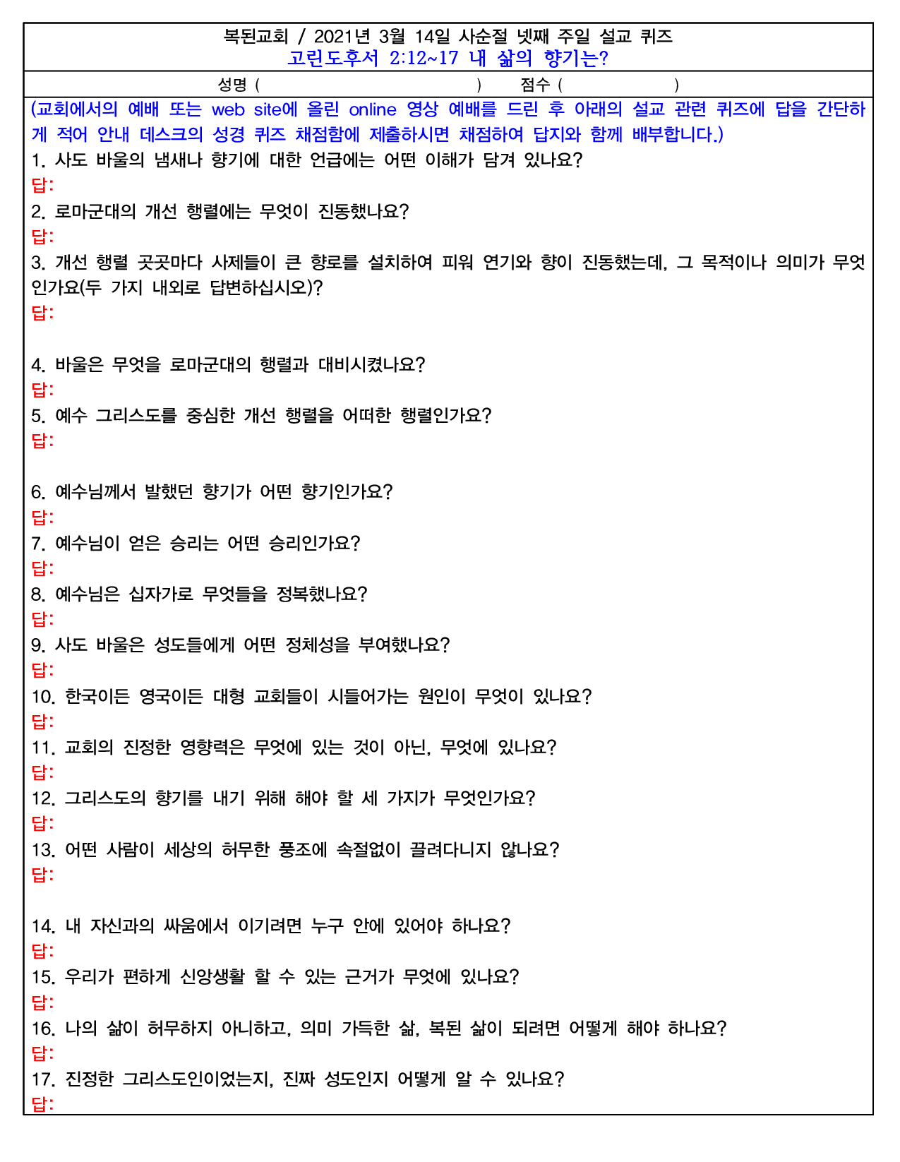 위 파일 다운로드를 클릭하면 설교 퀴즈를 보거나 다운로드 할 수 있습니다. 파일을 다운로드 후 인쇄하고 답을 작성하거나 아니면 문제를 보고 blank paper에 번호와 답을 적어 본당 안내 데스크에 제출하면 채점하여 정답지와 함께 묶어 배부합니다.