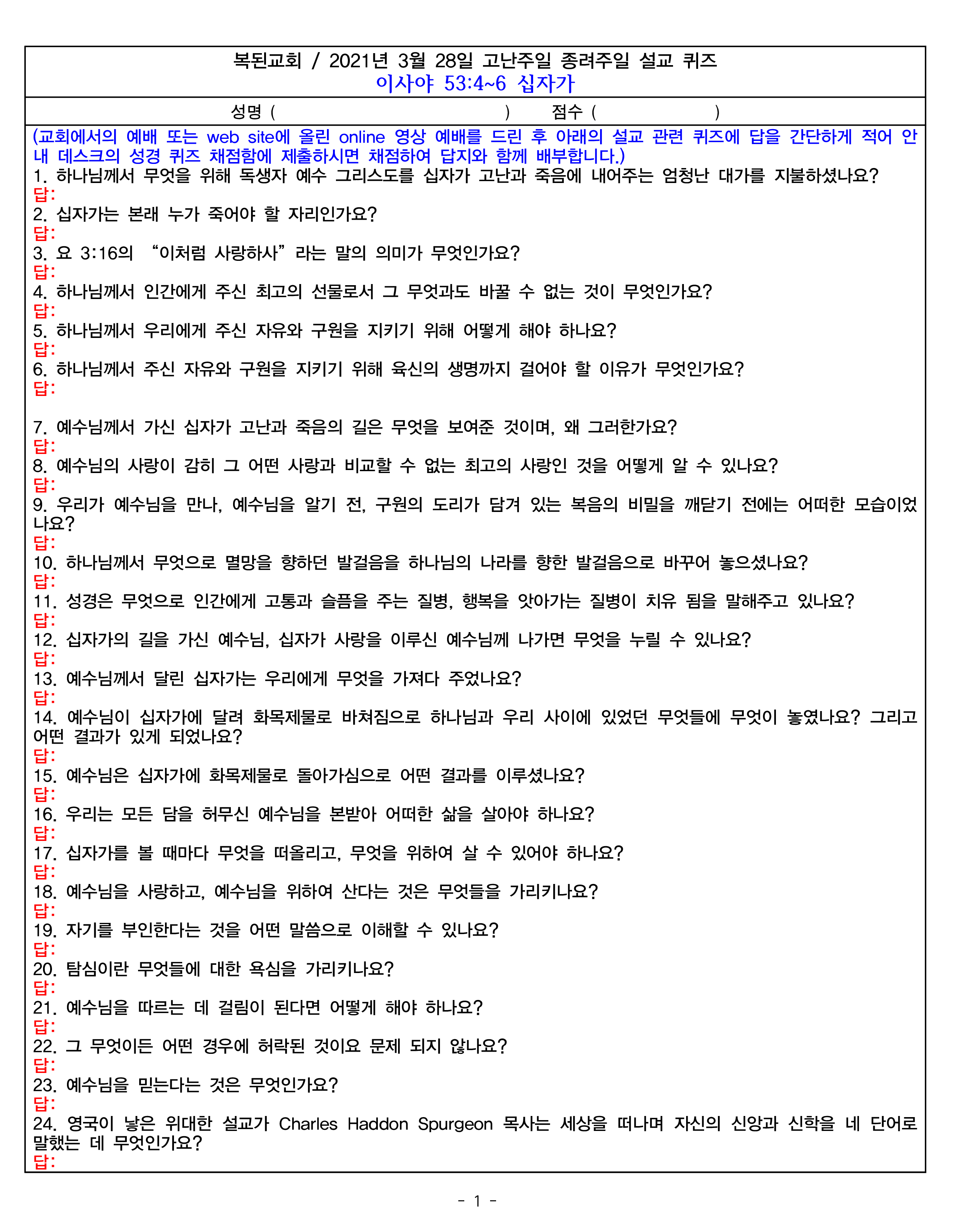 위 파일 다운로드를 클릭하면 설교 퀴즈를 보거나 다운로드 할 수 있습니다. 파일을 다운로드 후 인쇄하고 답을 작성하거나 아니면 문제를 보고 blank paper에 번호와 답을 적어 본당 안내 데스크에 제출하면 채점하여 정답지와 함께 묶어 배부합니다.