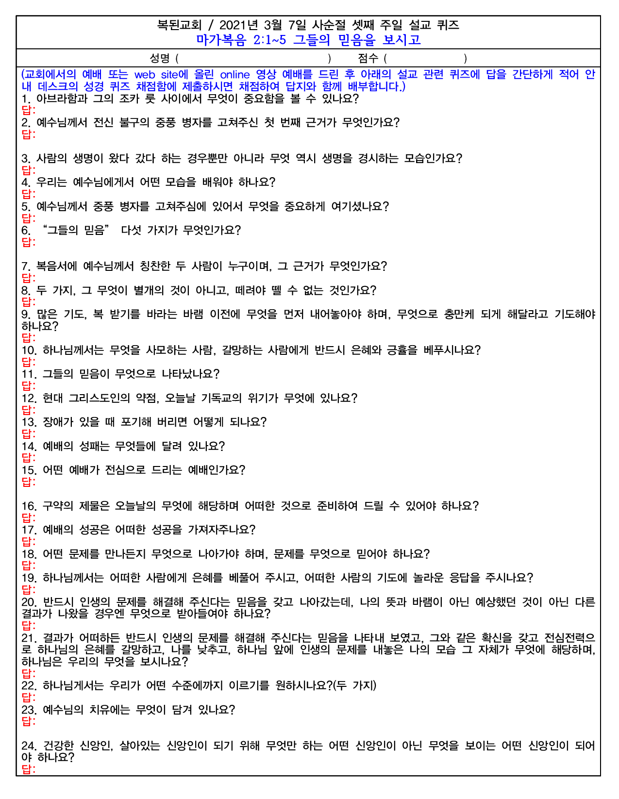 위 파일 다운로드를 클릭하면 설교 퀴즈를 보거나 다운로드 할 수 있습니다. 파일을 다운로드 후 인쇄하고 답을 작성하거나 아니면 문제를 보고 blank paper에 번호와 답을 적어 본당 안내 데스크에 제출하면 채점하여 정답지와 함께 묶어 배부합니다.