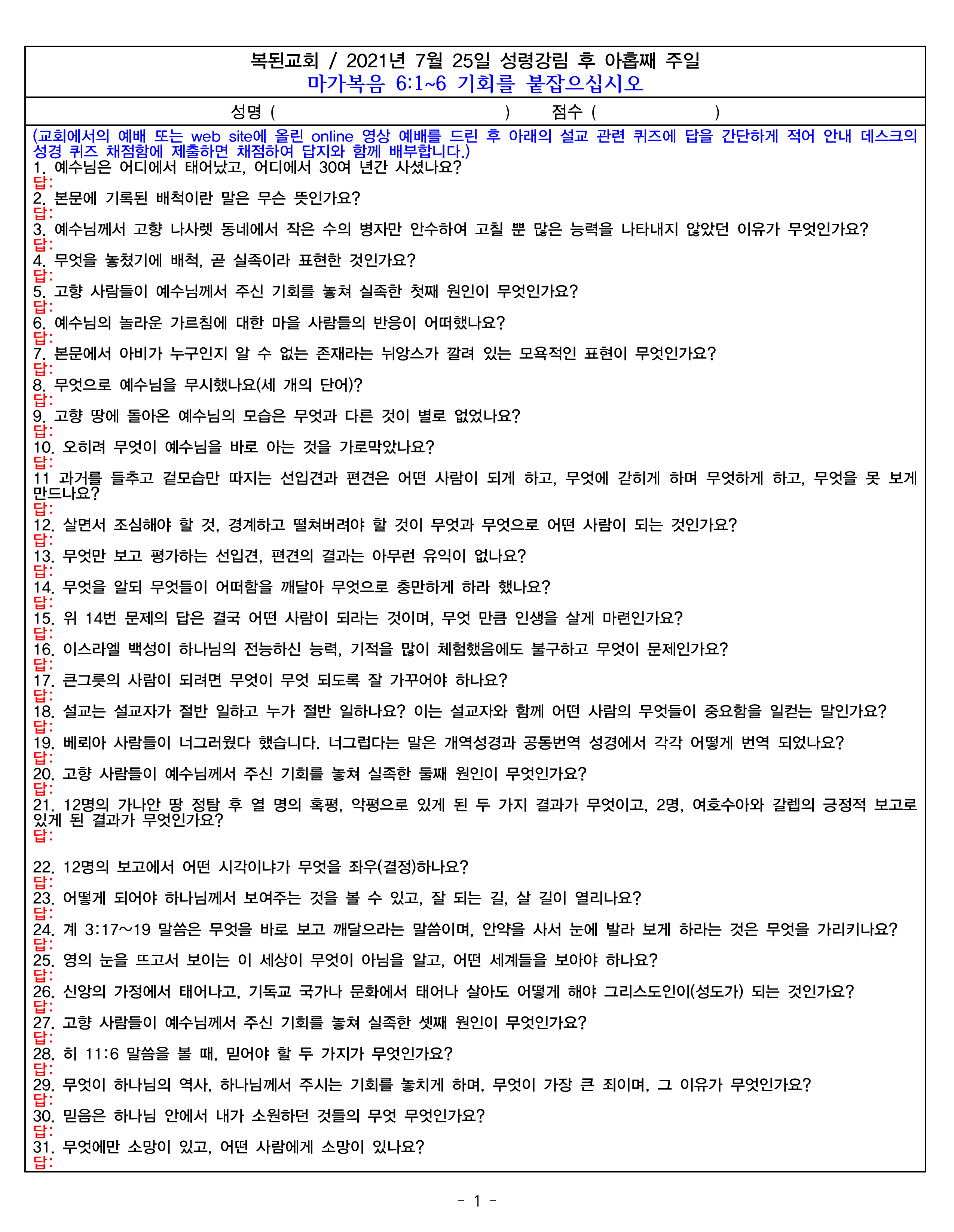 또 다른 방법은 아래의 댓글에 성명, email 주소와 함께 번호와 답을 적어 놓으면 채점한 파일과 정답 파일을 보내드립니다. 아래의 댓글에 답을 적는 example로서 2020년 9월 27일 주일 설교 퀴즈를 참고하십시오.
