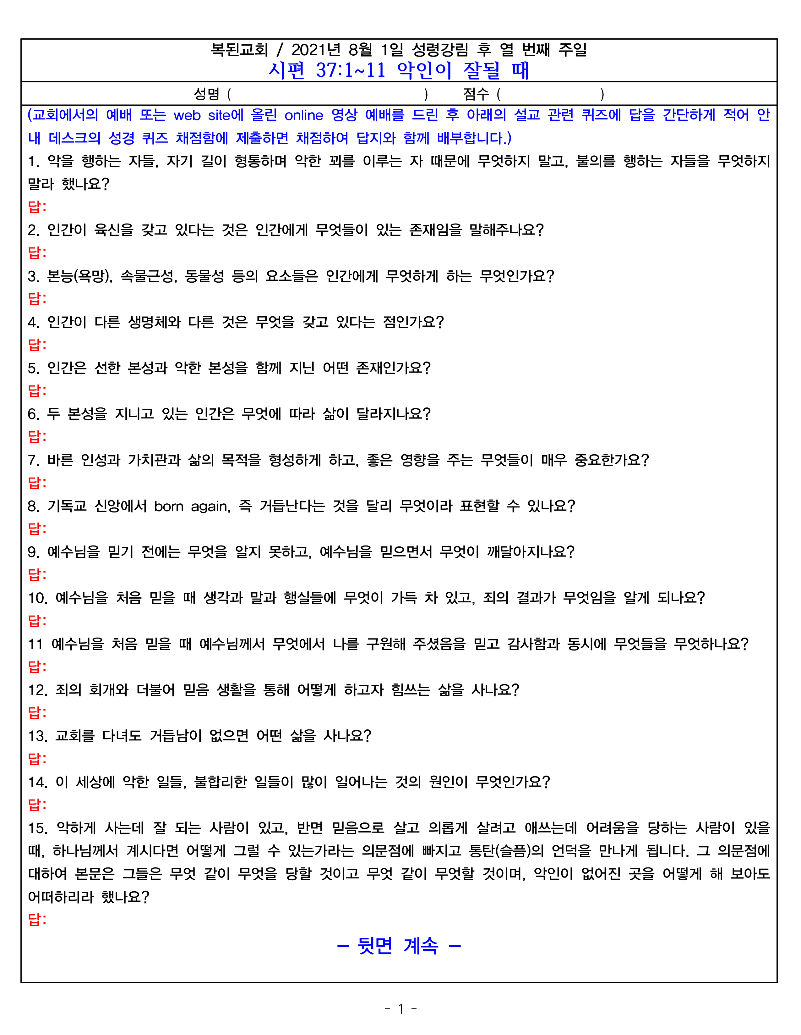 또 다른 방법은 아래의 댓글에 성명, email 주소와 함께 번호와 답을 적어 놓으면 채점한 파일과 정답 파일을 보내드립니다. 아래의 댓글에 답을 적는 example로서 2020년 9월 27일 주일 설교 퀴즈를 참고하십시오.