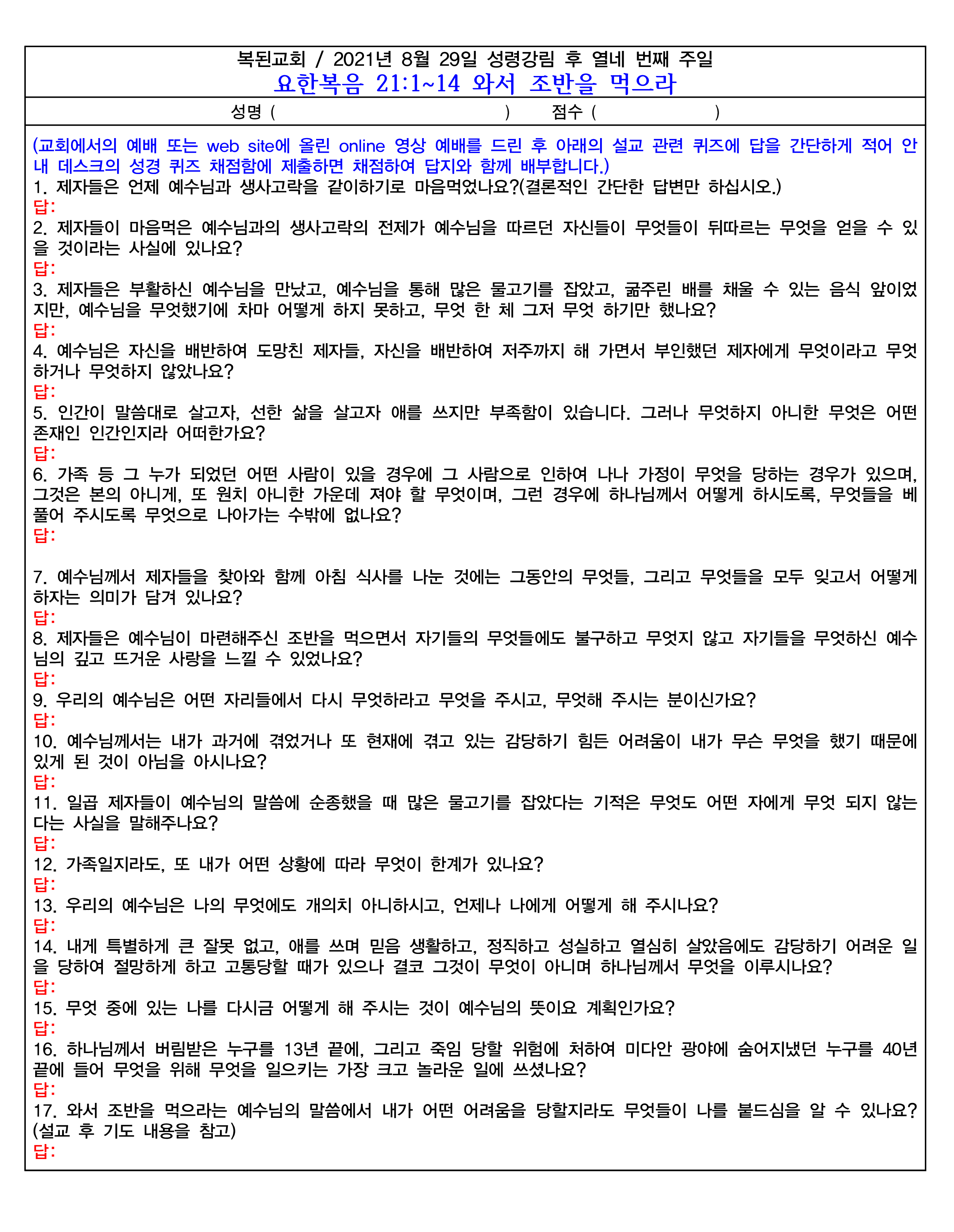 또 다른 방법은 아래의 댓글에 성명, email 주소와 함께 번호와 답을 적어 놓으면 채점한 파일과 정답 파일을 보내드립니다. 아래의 댓글에 답을 적는 example로서 2021년 8월 1일 주일 설교 퀴즈를 참고하십시오.