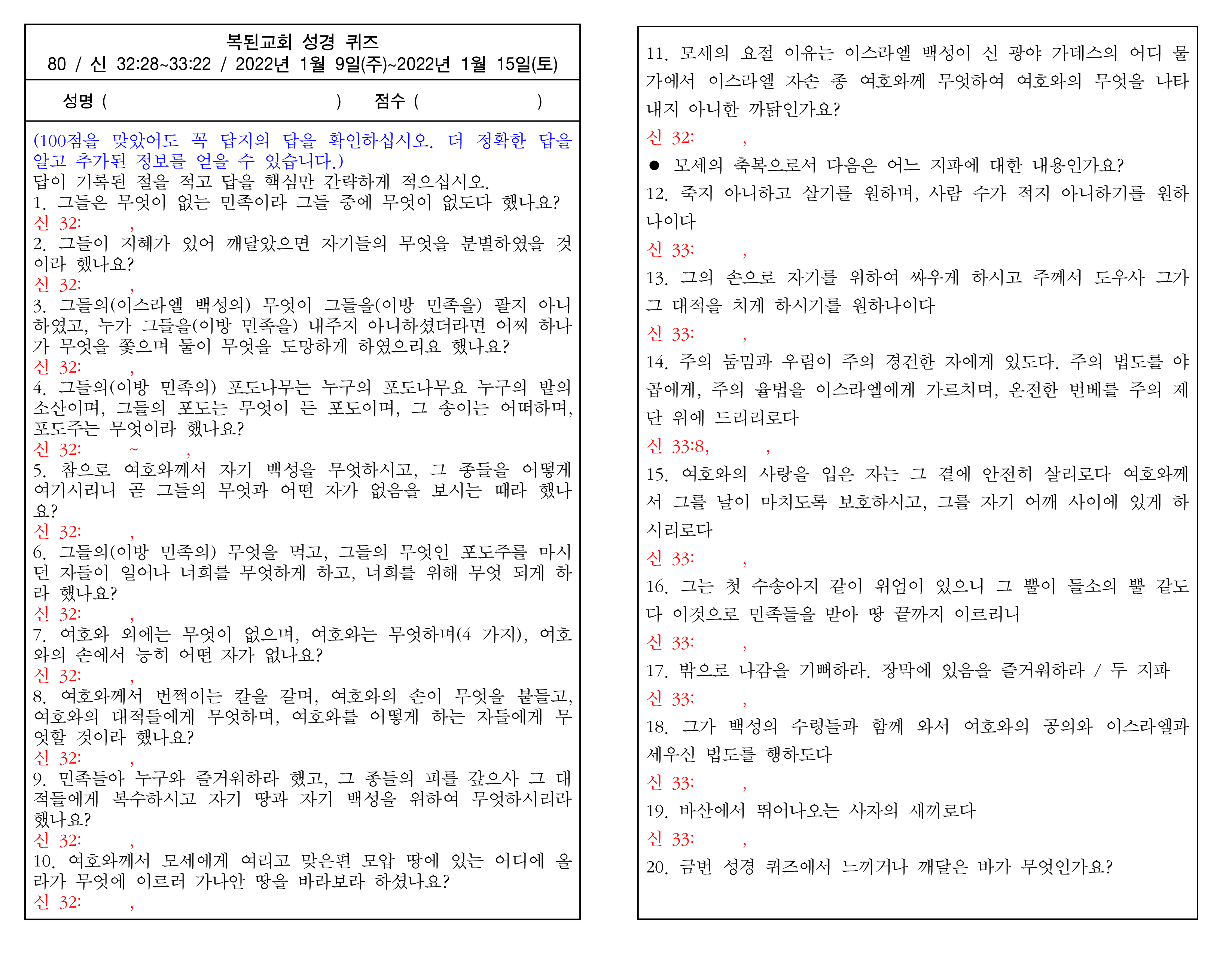 위 파일 다운로드를 클릭하면 성경 퀴즈를 보거나 다운로드 할 수 있습니다. 파일을 다운로드 후 인쇄하고 답을 작성하거나 아니면 문제를 보고 blank paper에 번호와 답을 적어 본당 안내 데스크에 제출하면 채점하여 정답지와 함께 묶어 배부합니다.
