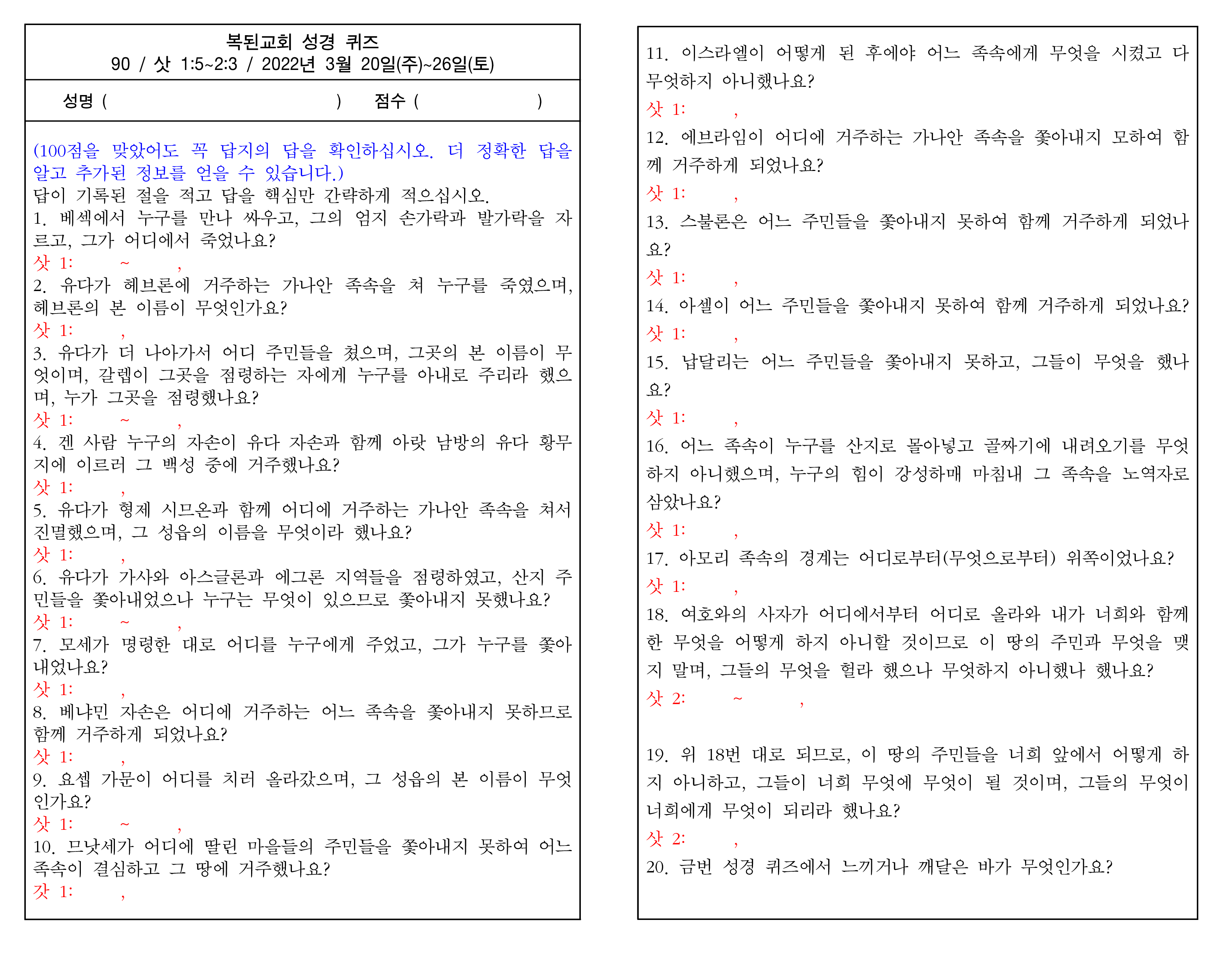 또 다른 방법은 아래의 댓글에 성명, email 주소와 함께 번호와 답을 적어 놓으면 채점한 파일과 정답 파일을 보내드립니다. 아래의 댓글에 답을 적는 example로서 3월 6일 주일 성경 퀴즈를 참고하십시오.