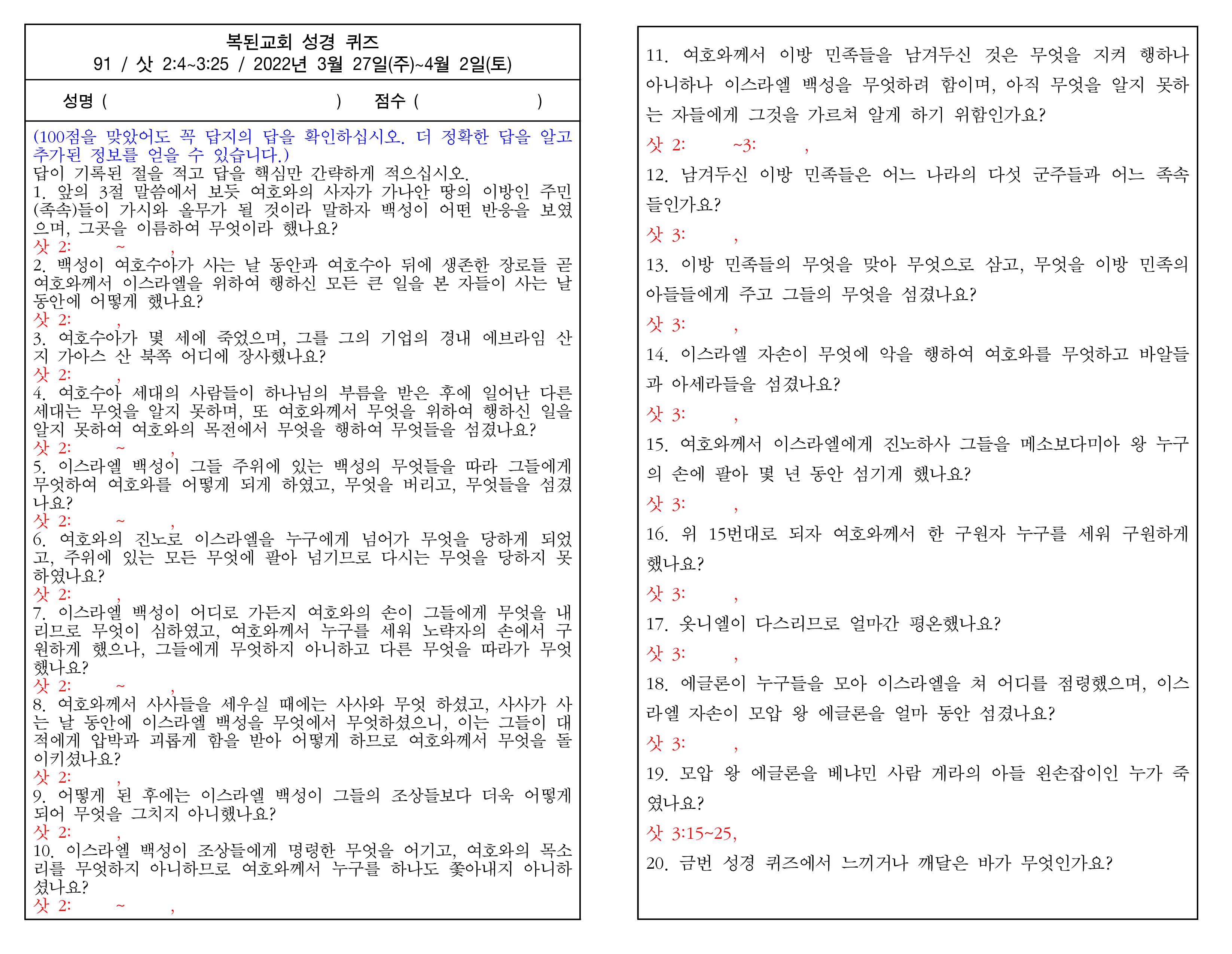또 다른 방법은 아래의 댓글에 성명, email 주소와 함께 번호와 답을 적어 놓으면 채점한 파일과 정답 파일을 보내드립니다. 아래의 댓글에 답을 적는 example로서 3월 6일 주일 성경 퀴즈를 참고하십시오.