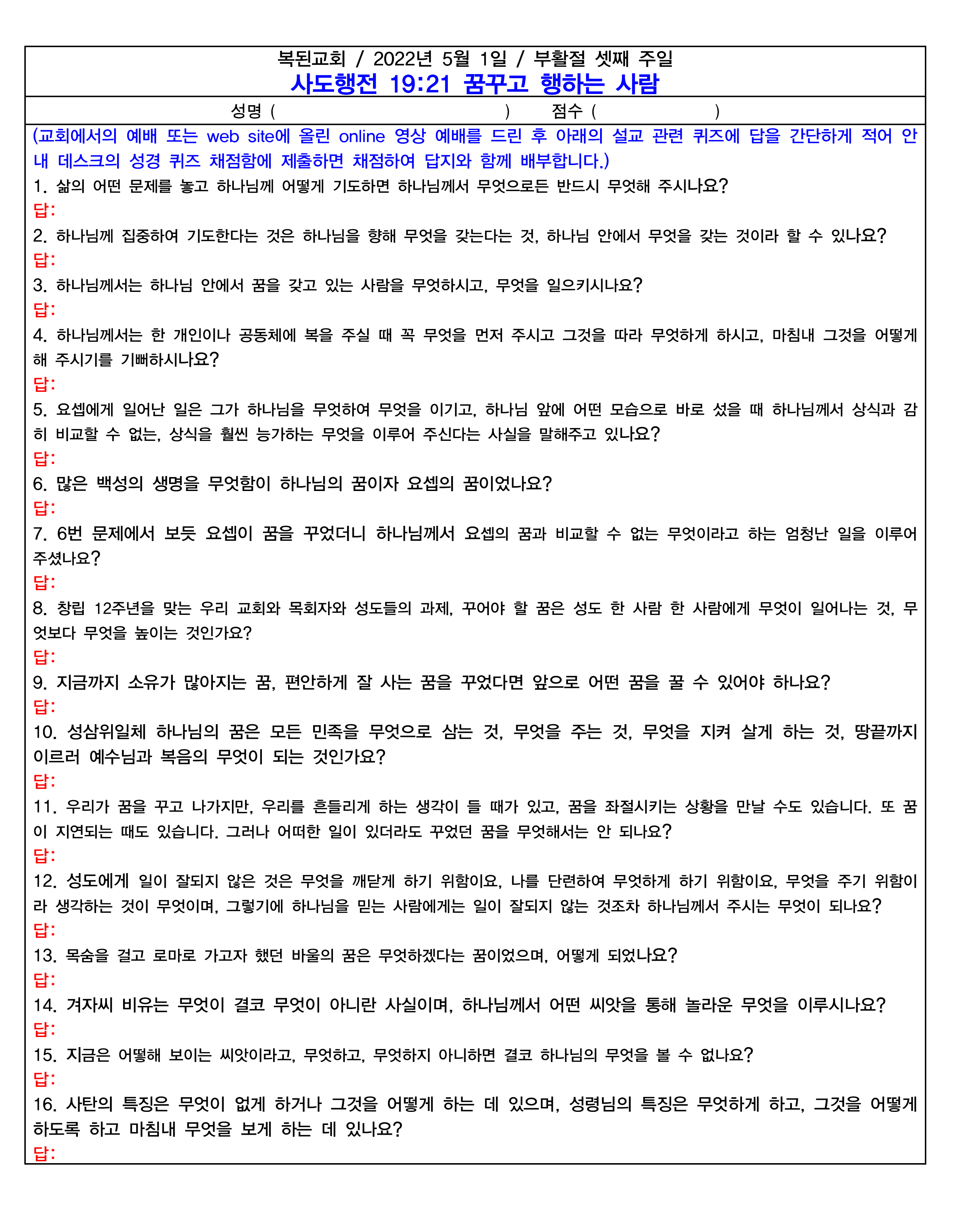 위 파일 다운로드를 클릭하면 설교 퀴즈를 보거나 다운로드 할 수 있습니다. 파일을 다운로드 후 인쇄하고 답을 작성하거나 아니면 문제를 보고 blank paper에 번호와 답을 적어 본당 안내 데스크에 제출하면 채점하여 정답지와 함께 묶어 배부합니다.