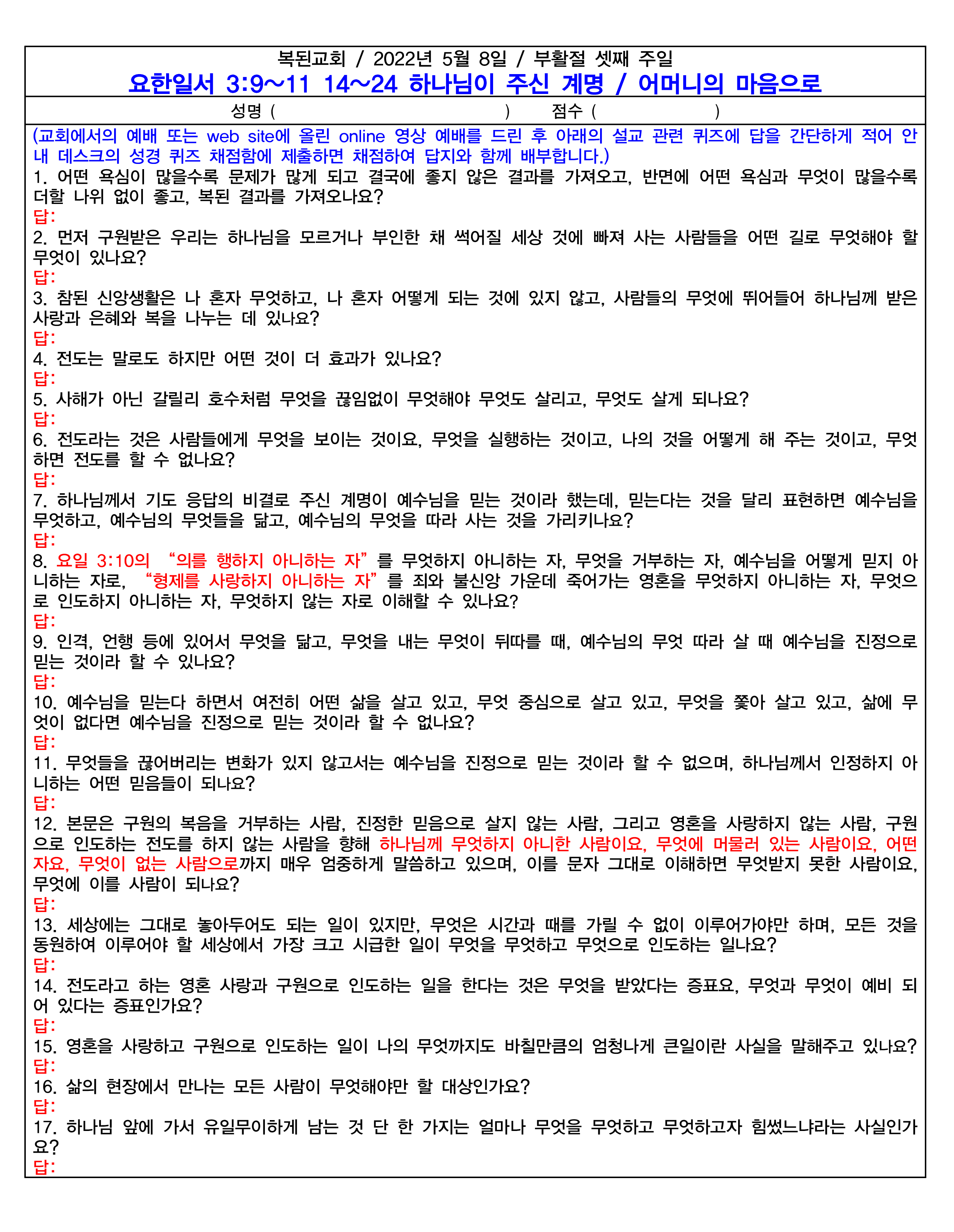 위 파일 다운로드를 클릭하면 설교 퀴즈를 보거나 다운로드 할 수 있습니다. 파일을 다운로드 후 인쇄하고 답을 작성하거나 아니면 문제를 보고 blank paper에 번호와 답을 적어 본당 안내 데스크에 제출하면 채점하여 정답지와 함께 묶어 배부합니다.
